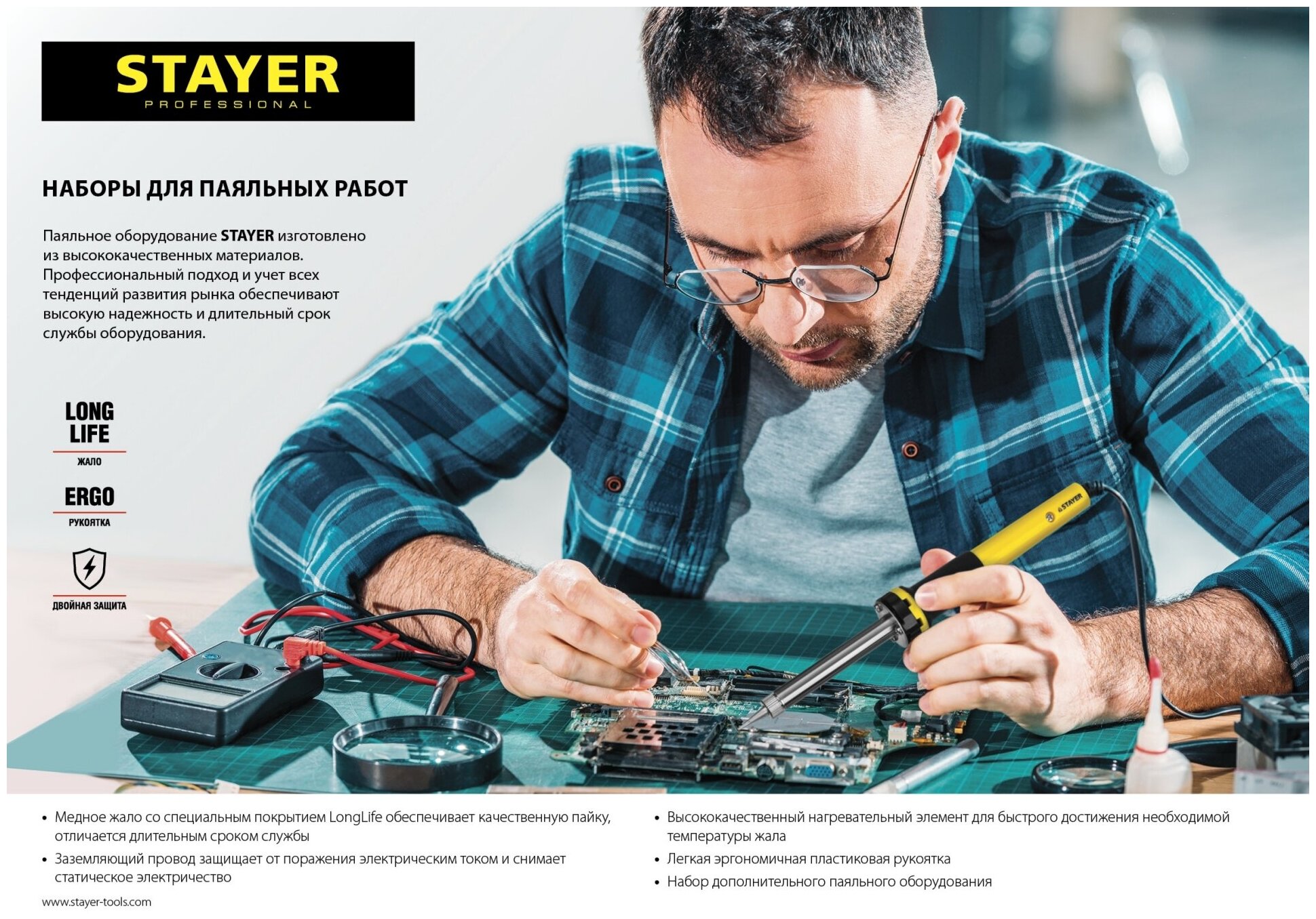 СохранитьSTAYER PROTerm 60Вт с 2К рукояткой, конус, подставка+припой+сменное жало+оловоотсос+сменная насадка, Набор для паяльных работ (55313-60-H6) интересное: