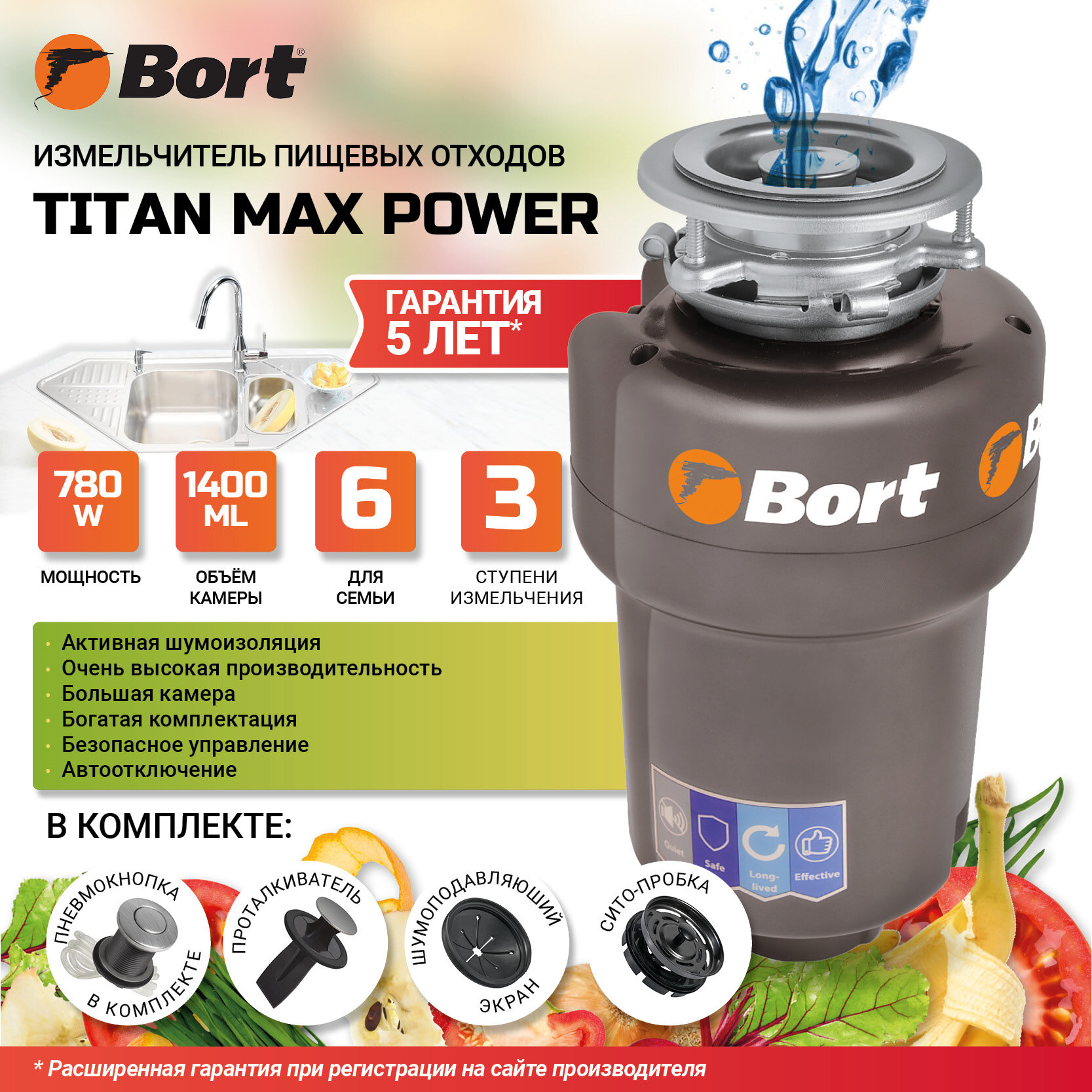 Bort Измельчитель пищевых отходов TITAN MAX Power {780 Вт; 1400 мл; 3800 об/мин; 6,3 кг; 220 В; 50 Гц; набор аксессуаров 4 шт} [1275790]