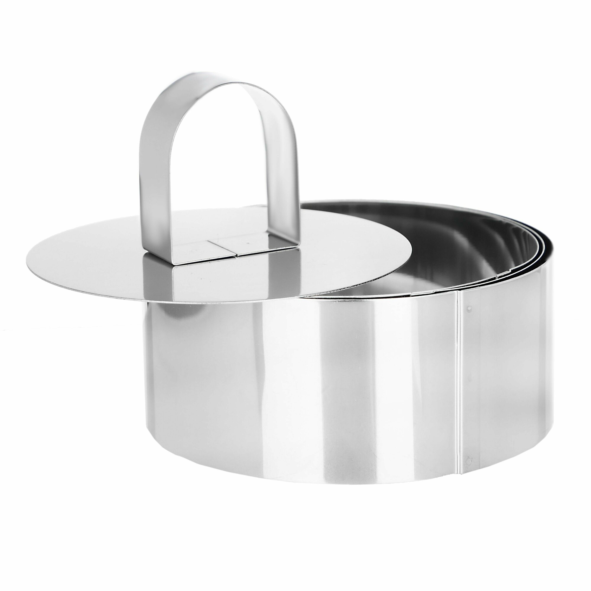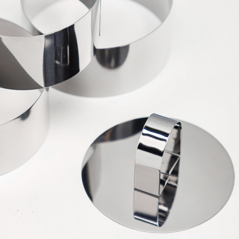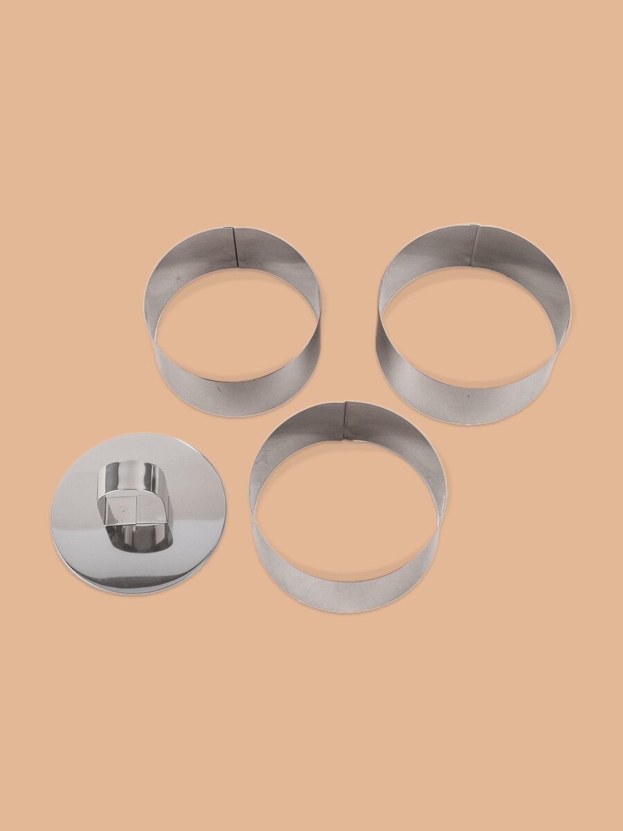 Очень удобный набор кольцевых формочек для подачи салатов. Всего 4 кольца и крышка с ручкой для выдавливания продукции. Размеры 9х4 см. Материал нержавейка. Недостатки: Очень маленькая. Просто малюпусенькая. |