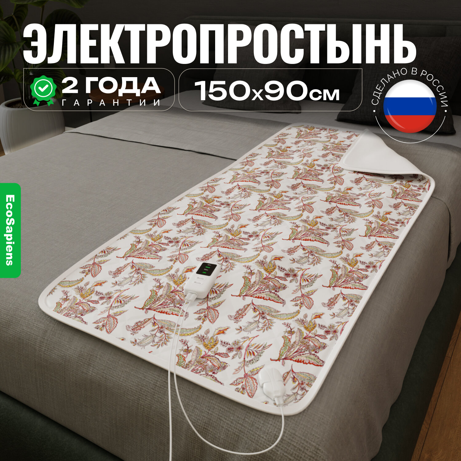 Инфракрасная электропростынь для обогрева тела EcoSapiens Linen 150х90 см, артикул ES-412, 3 режима, автоотключение через 360 минут (6 часов) работы