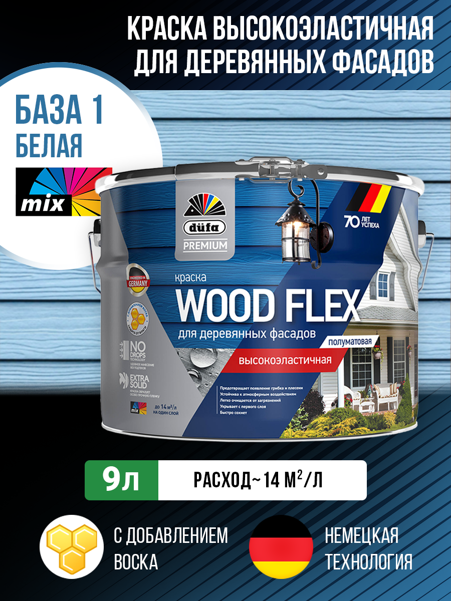 Краска для деревянных фасадов Dufa Premium Woodflex полуматовая (9л) 1 (белая и под колеровку)