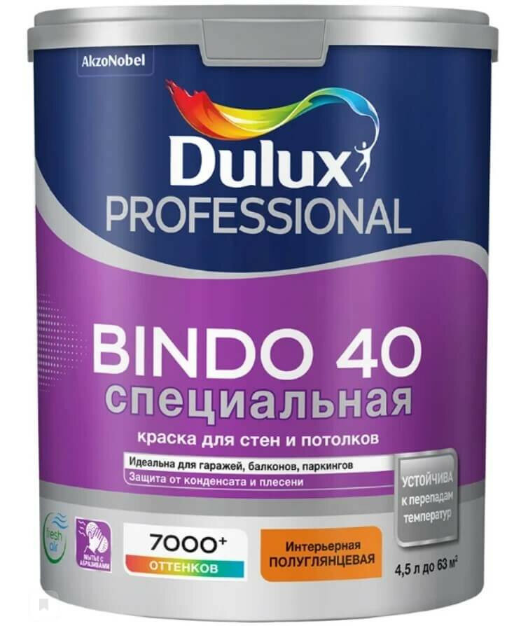 Краска для стен и потолков Dulux Professional Bindo 40, латексная специальная, полуглянцевая база BW 9 л.