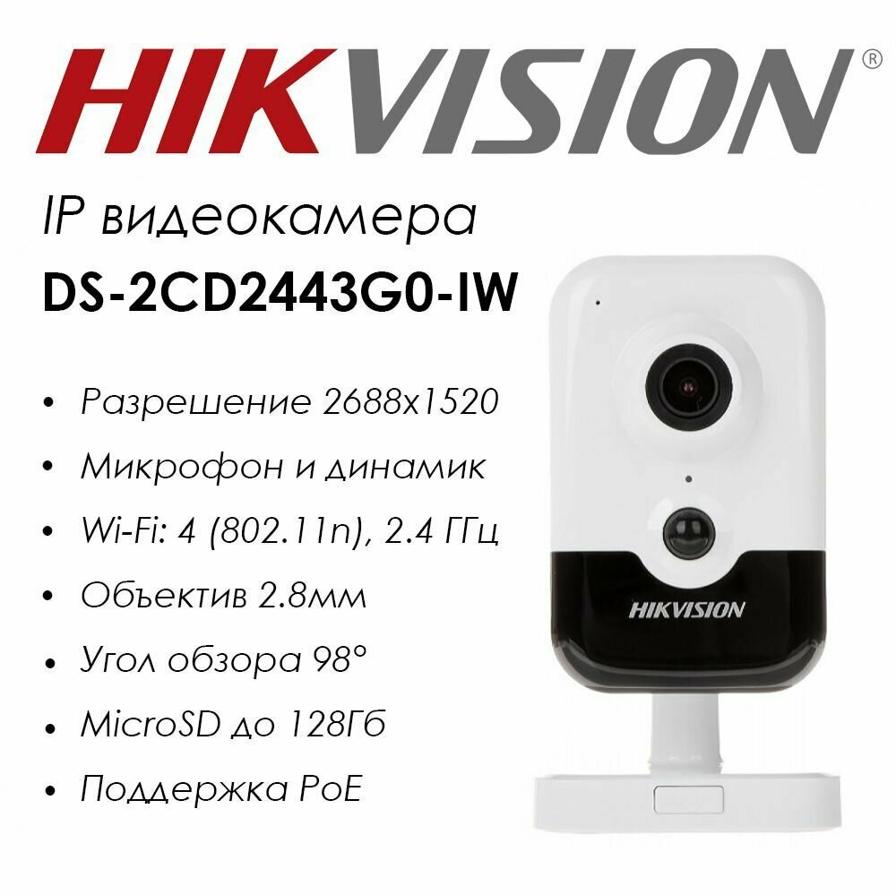 IP камера HikVision DS-2CD2443G0-IW (2.8mm), кубическая, 4МП, 2688x1520, H.265+, микрофон, 114гр, PoE, серо-белая