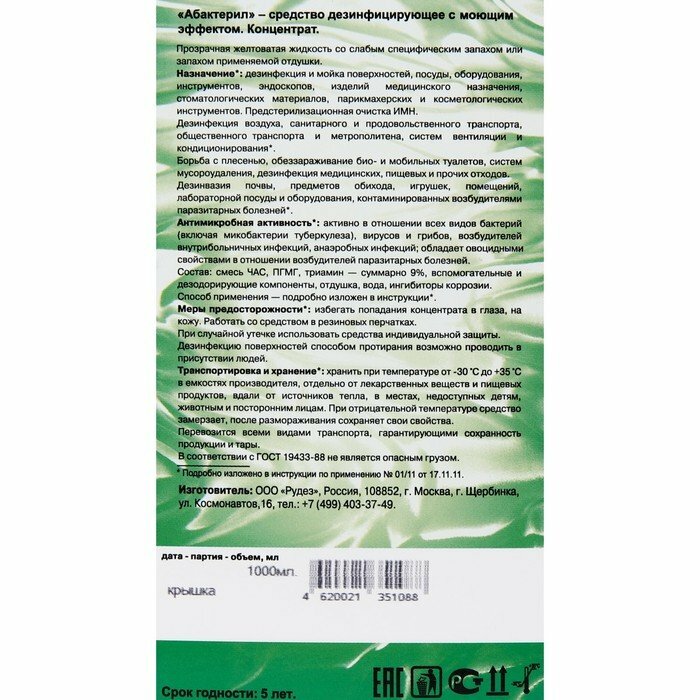 1 шт. Дезинфицирующее средство с вирулицидной активностью ГОСТ 12.1.007-76 Абактерил 500 мл. концентрат
