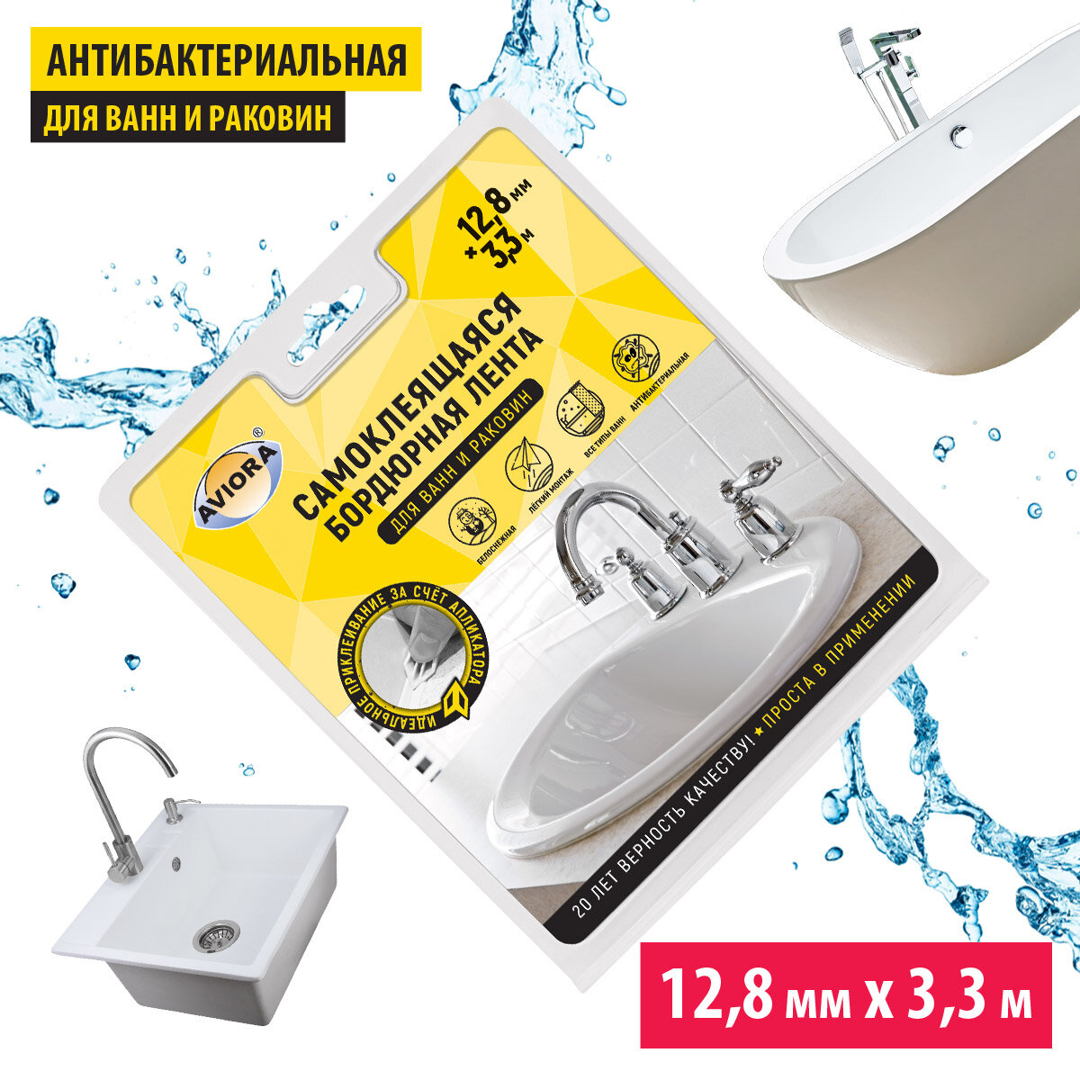 Aviora Бордюрная самоклеящаяся лента Aviora для ванн и раковин, 12,8 мм х 3,35 м