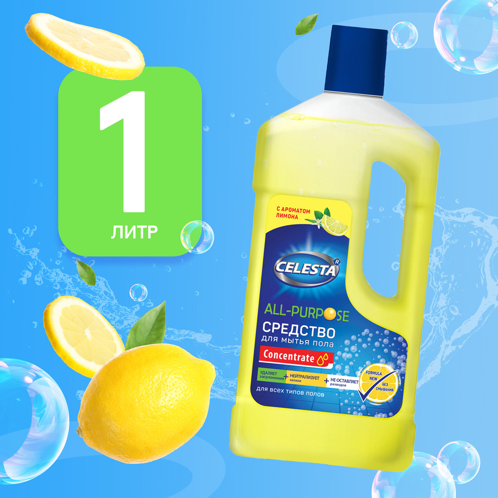 Средство для мытья пола Celesta Лимон, моющая жидкость для влажной уборки, универсальная, 1 литр