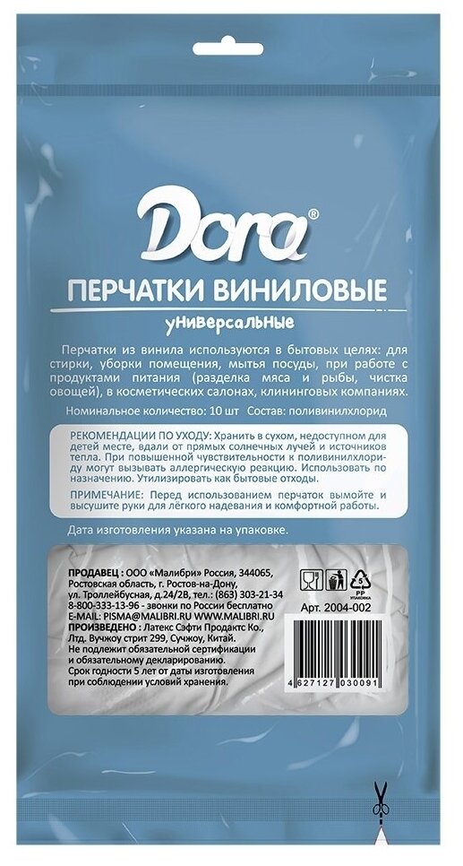 Dora Перчатки универсальные 10 шт виниловые, размер - M 2004-002M
