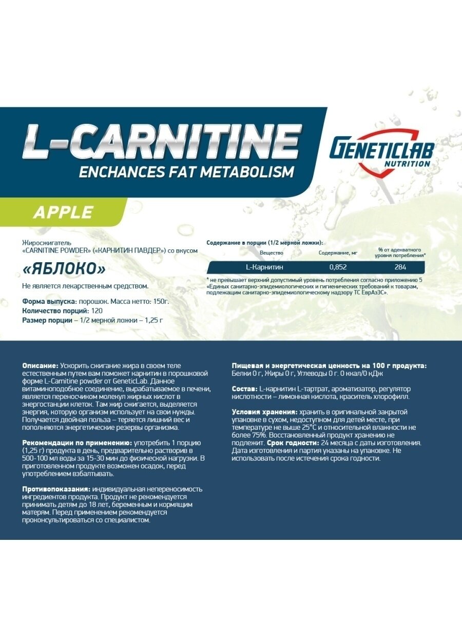 GeneticLab Nutrition L-Carnitine Powder (150гр) Яблоко