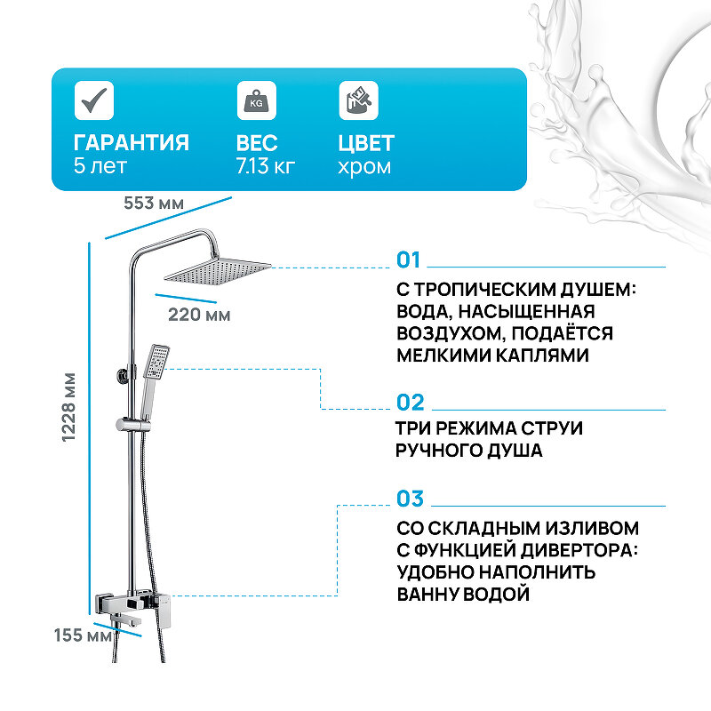 | Дополнительная информация | высота стойки для душа: 1150 мм; длина верхнего душа: 220 мм; ширина верхнего душа: 220 мм |