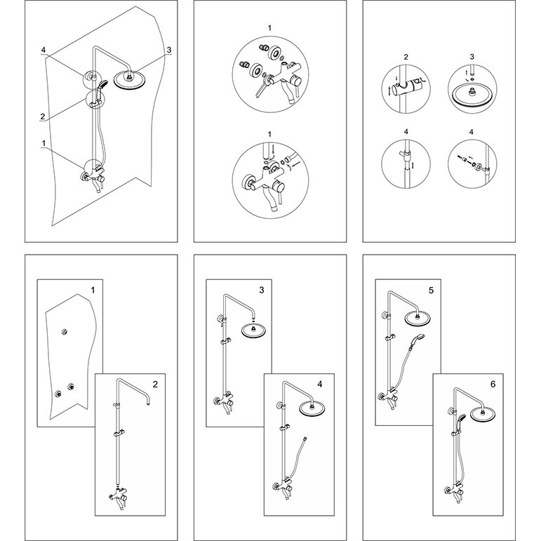 | Комплектация | верхний душ / стойка / лейка для душа / шланг для душа, комплект монтажа / возвратный клапан / переключатель с верхнего на ручной душ / Смеситель для ванны |
