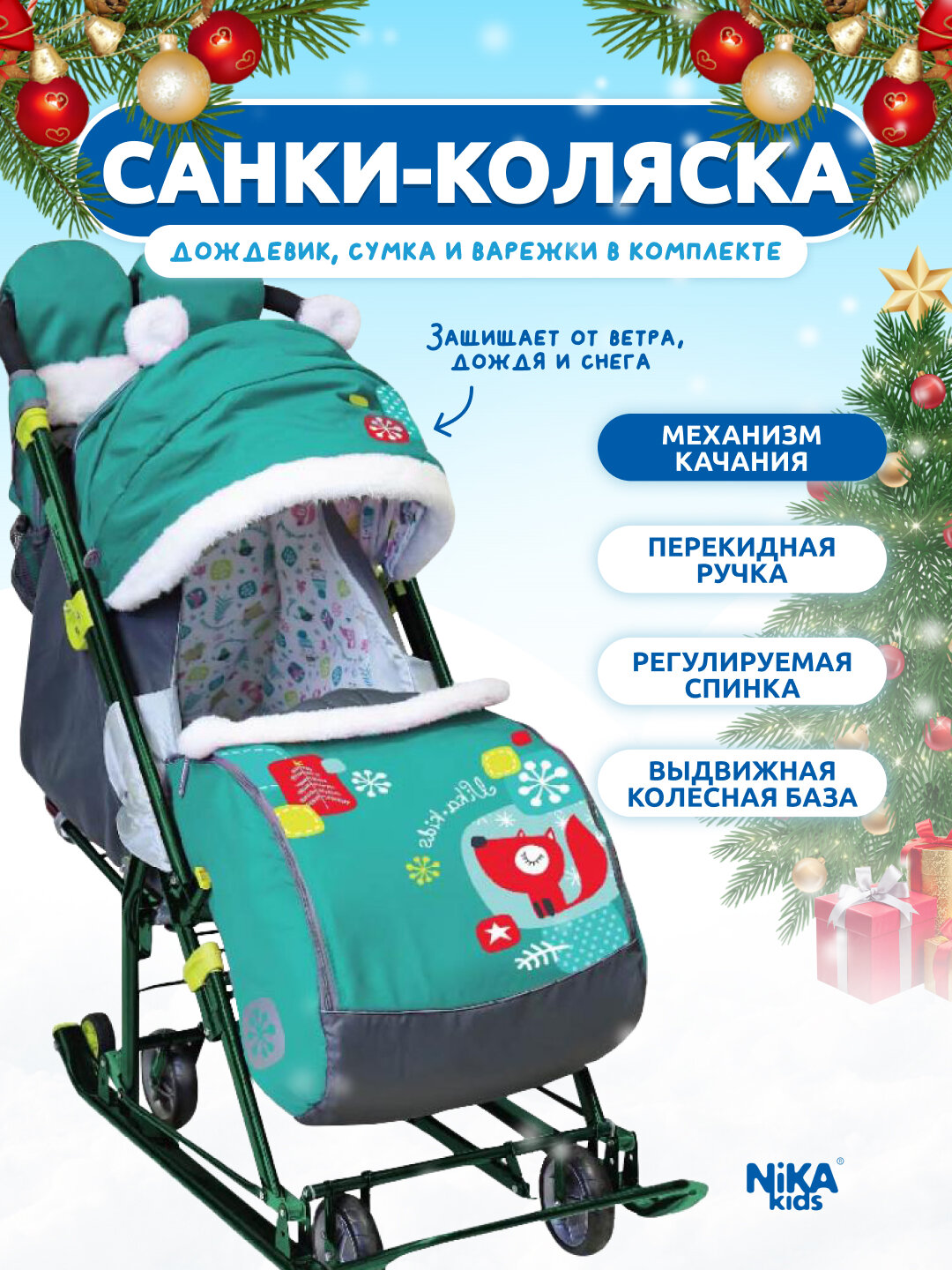 Купить Санки-коляска Ника детям "7-6", с лисичкой, изумрудный, механизм качания, ветрозащитный тент (НД7-6/4)