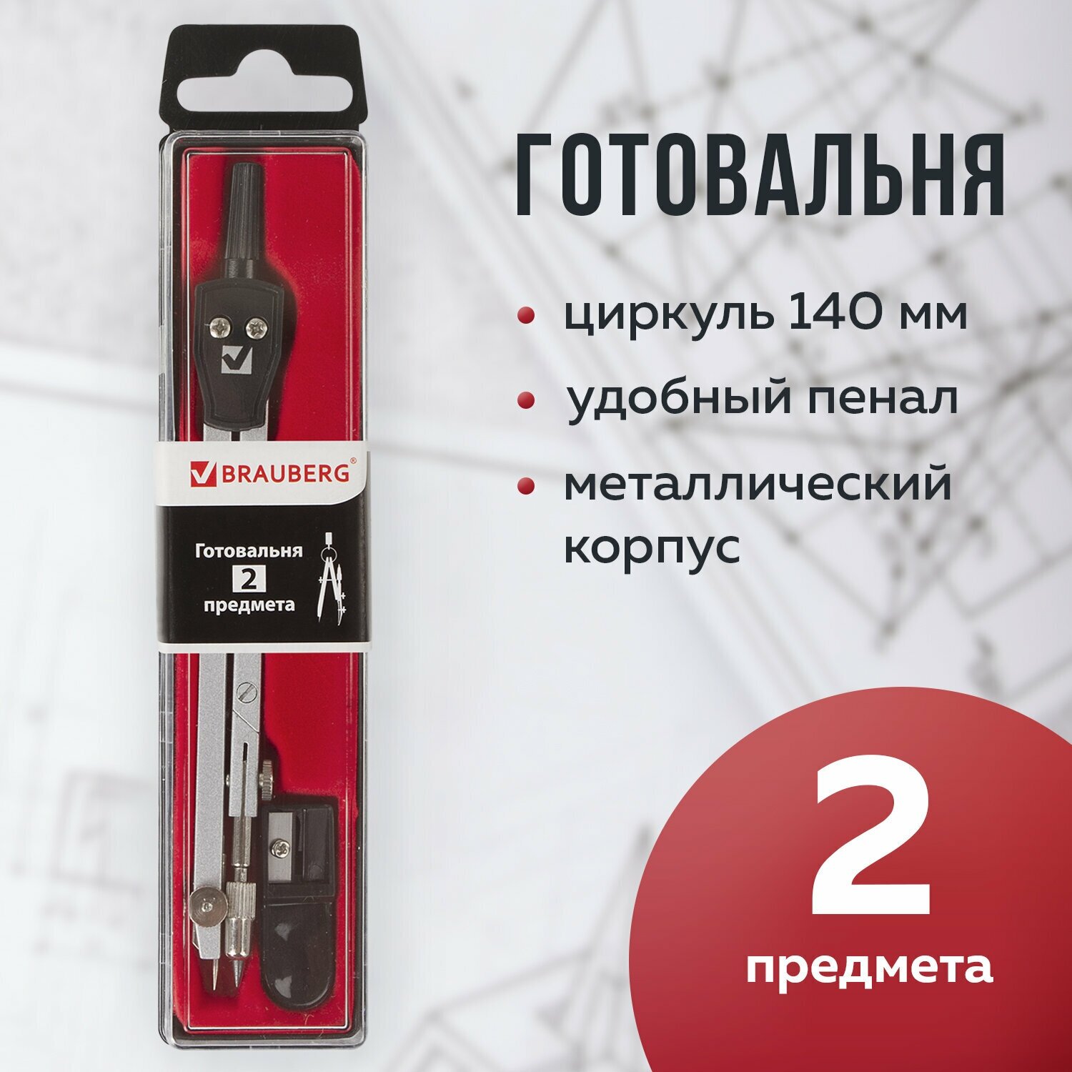 Готовальня BRAUBERG "Architect" 2 предмета: циркуль 140 мм со сгибаемой ножкой точилка пенал с подвесом, 4 шт