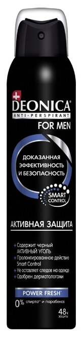 Дезодорант мужской антиперспирант Deonica For Men "Активная защита". Спрей, 200 мл. Содержит активный уголь, нейтрализующий бактерии. Не оставляет следов на одежде