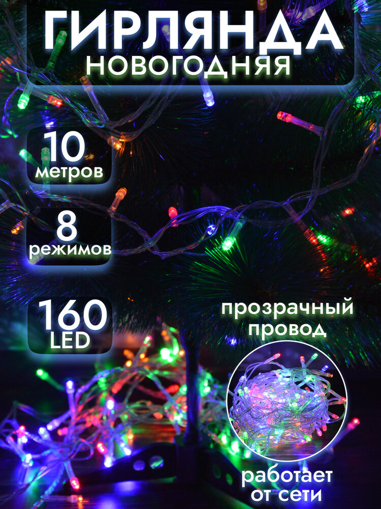 Электрогирлянда светодиодная LED160-10-MC, многоцветная, 160 LED, 10м, 8 режимов 101527