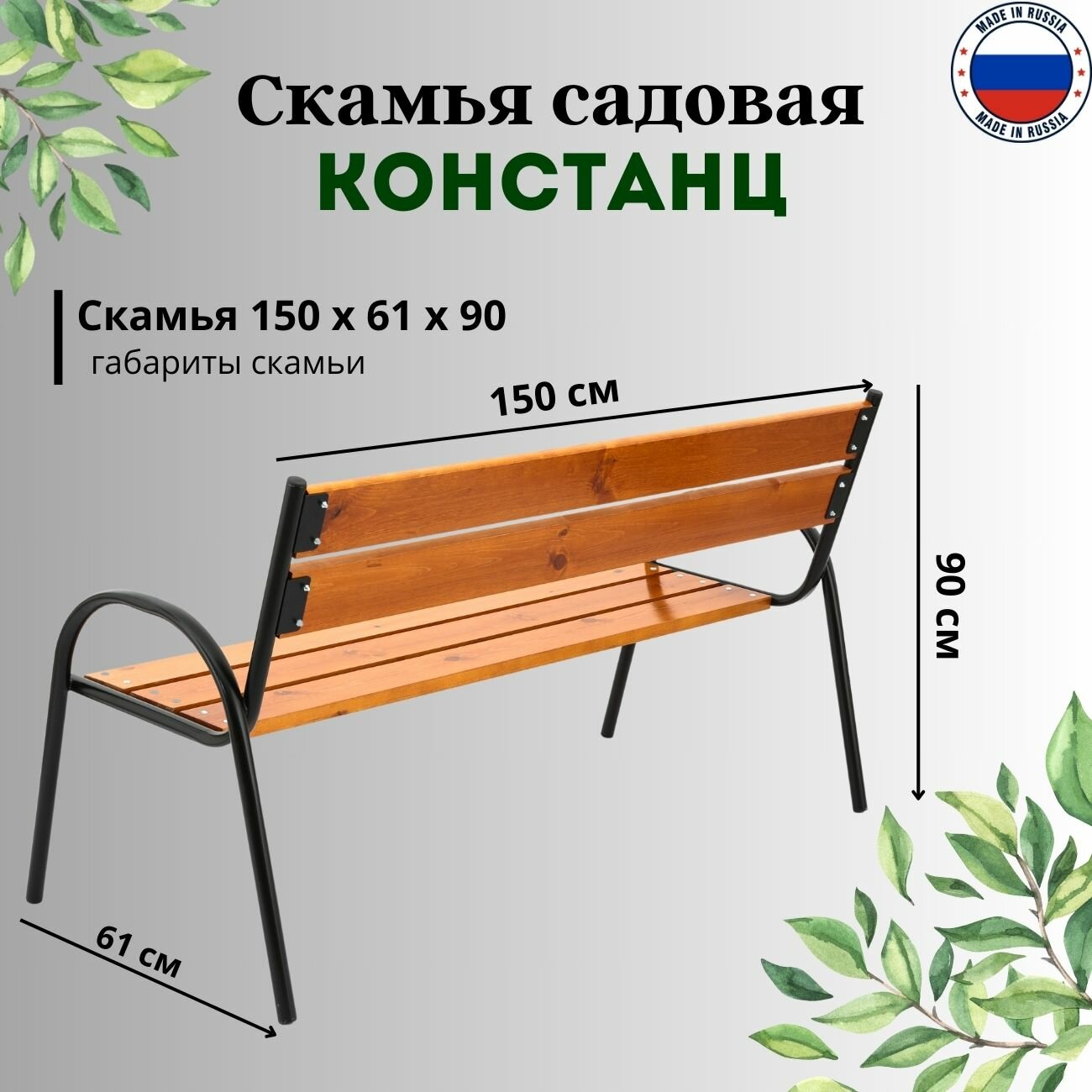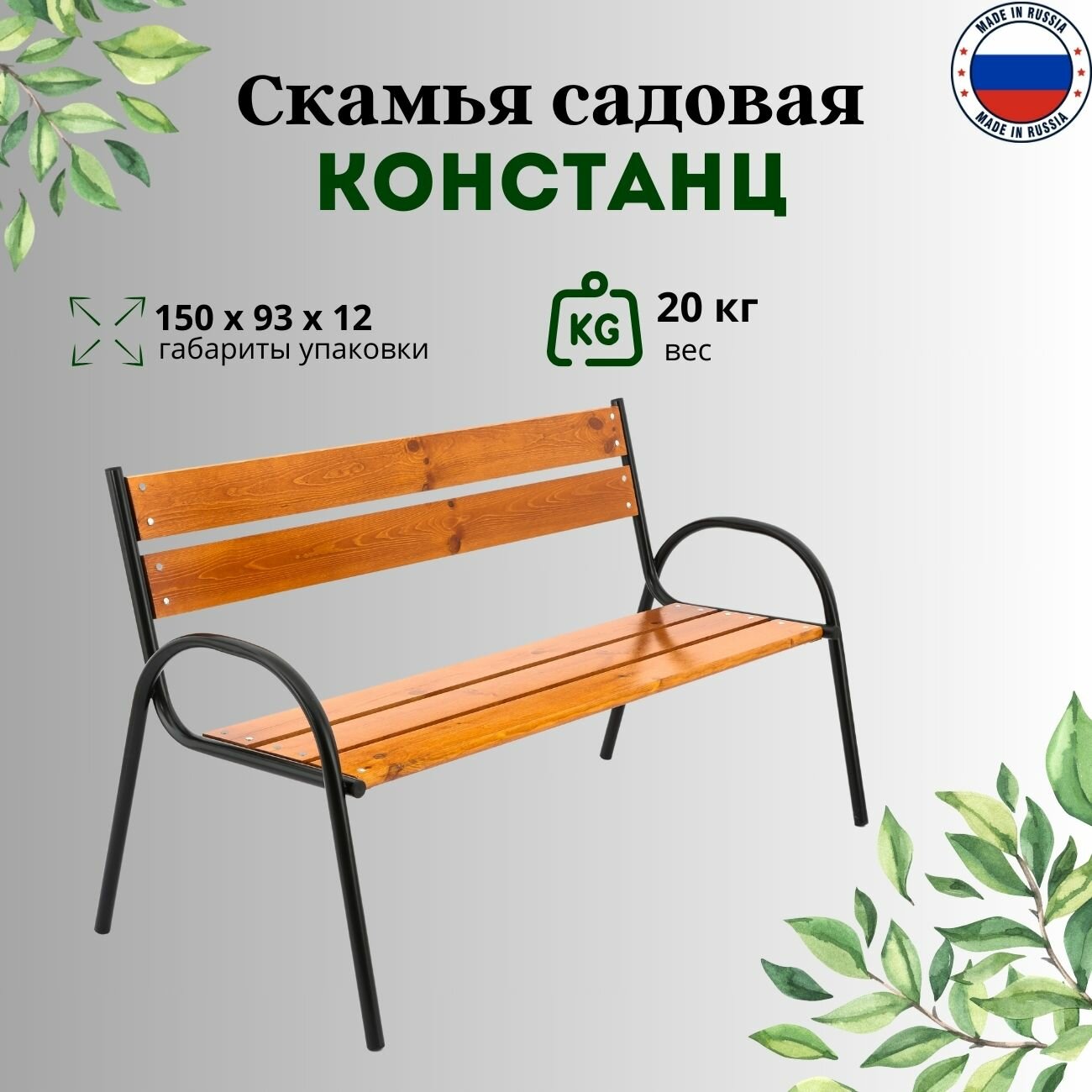 Скамейка садовая Классика с деревянными спинкой и сиденьем без покраски, лавочка для дачи с металлическим каркасом