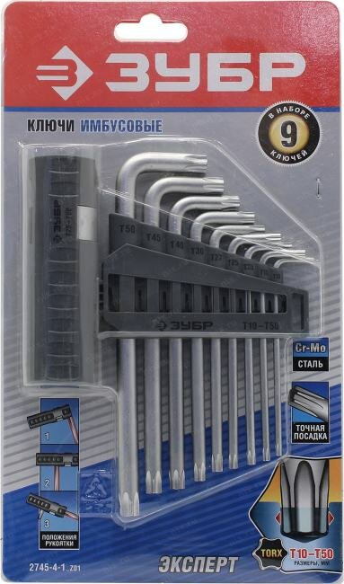 Набор ЗУБР Ключи эксперт имбусовые длинные с шариком, Cr-Mo, сатинир. покр., держатель-рукоятка, TORX Т10-Т50, 9 пред 2745-4-1_z01