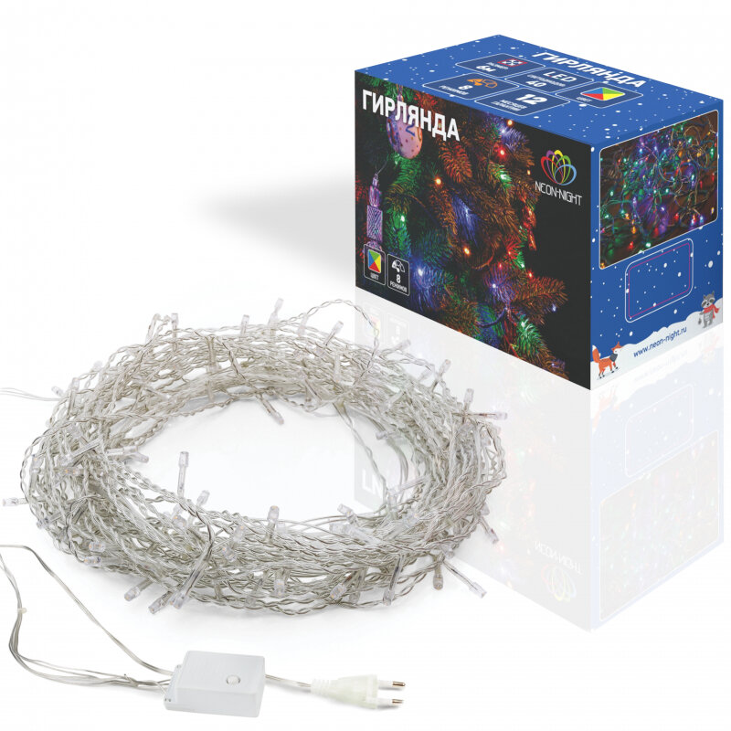 Светодиодная гирлянда NEON-NIGHT "Твинкл-Лайт" 10 м, 8 режимов, 80 разноцветных светодиодов, прозрачный провод