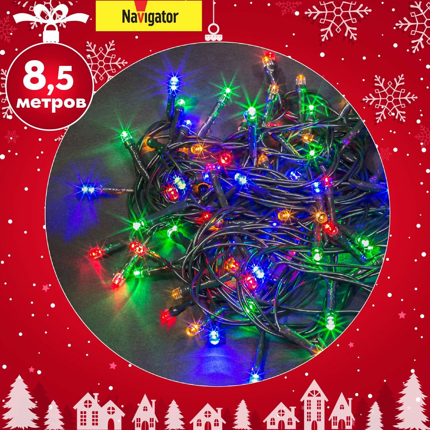 Гирлянда светодиодная Нить Navigator 61 814, 8.5 м, разноцветный свет, зеленый провод, IP20
