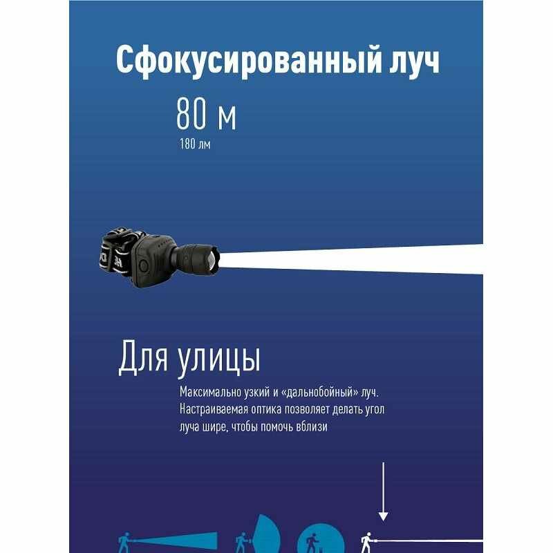 Налобный фонарь Космос KOC-H3W-LED, с фокусирующей линзой, 3 режима работы, регулируемый угол наклона, батарейки 3хААА входят в комплект
