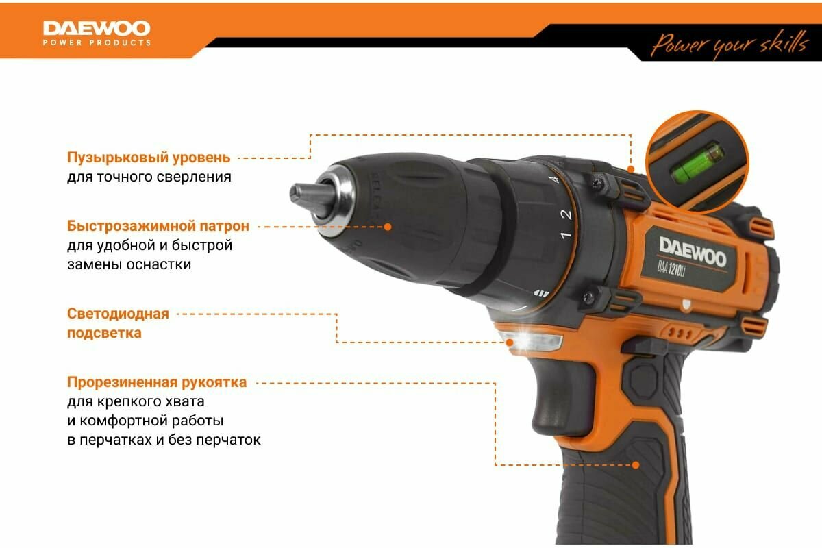 Дрель-шуруповёрт DAEWOO DAA 1210Li, 12В, быстрозажимной патрон, Li-Ion аккумулятор, 1 шт
