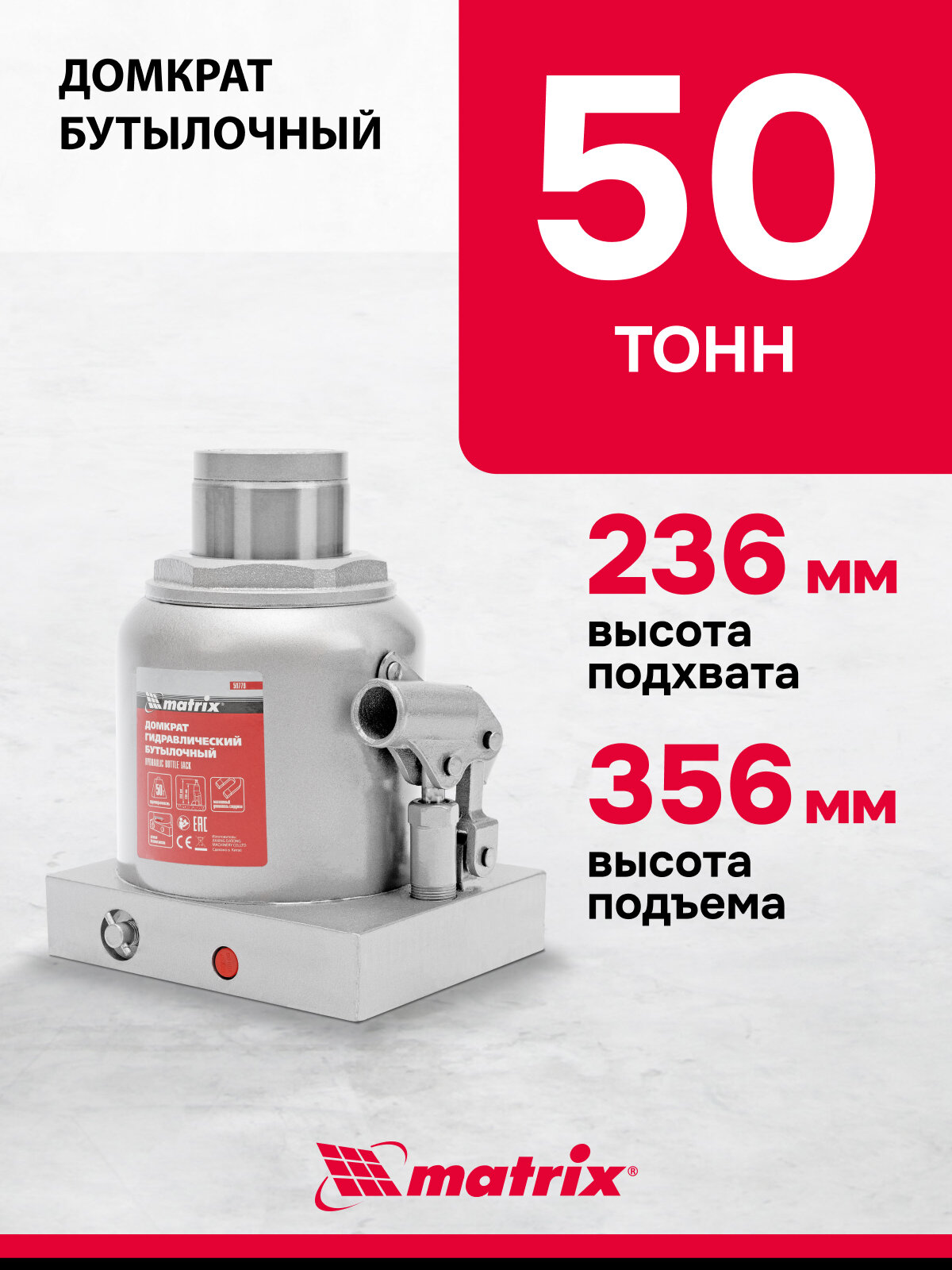 Домкрат гидравлический бутылочный Matrix 50 т, h подъема 236–356 мм 50779