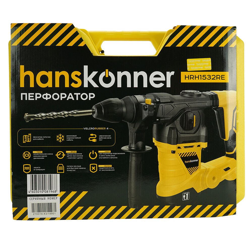 HRH1532RE Перфоратор Hanskonner 1500Вт,3 реж,6Дж,0-4500уд/мин,0-850об/мин,вертикал.4м каб. кейс Hanskonner