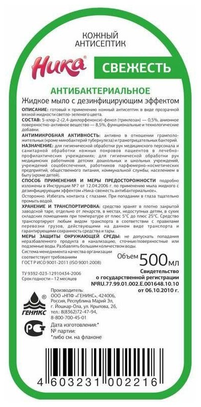 Мыло жидкое Ника дезинфицирующее 500 мл, "Свежесть", антибактериальное, дозатор ()