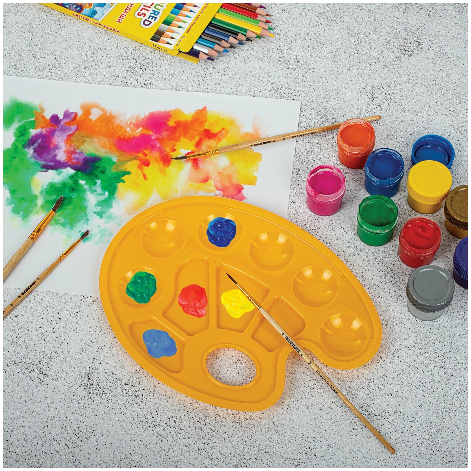 Палитра для рисования, для смешивания красок детская овальная в школу, 6 ячеек для красок и 4 для смешивания, желтая, Юнландия, 227807