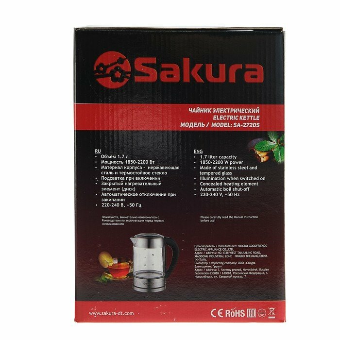 Купить SAKURA Чайник электрический Sakura SA-2720SBK, стекло, 1.7 л, 2200 Вт, серебристый