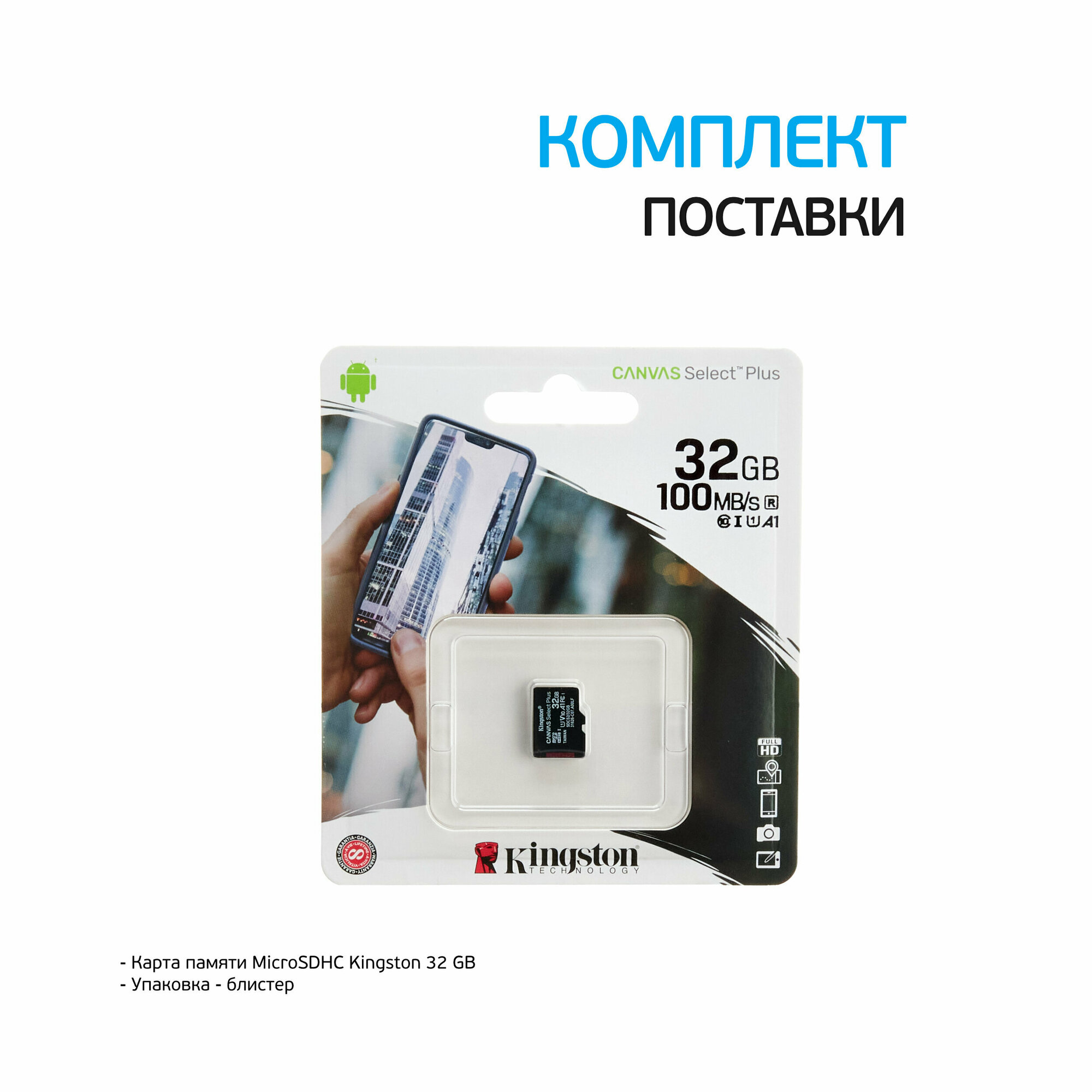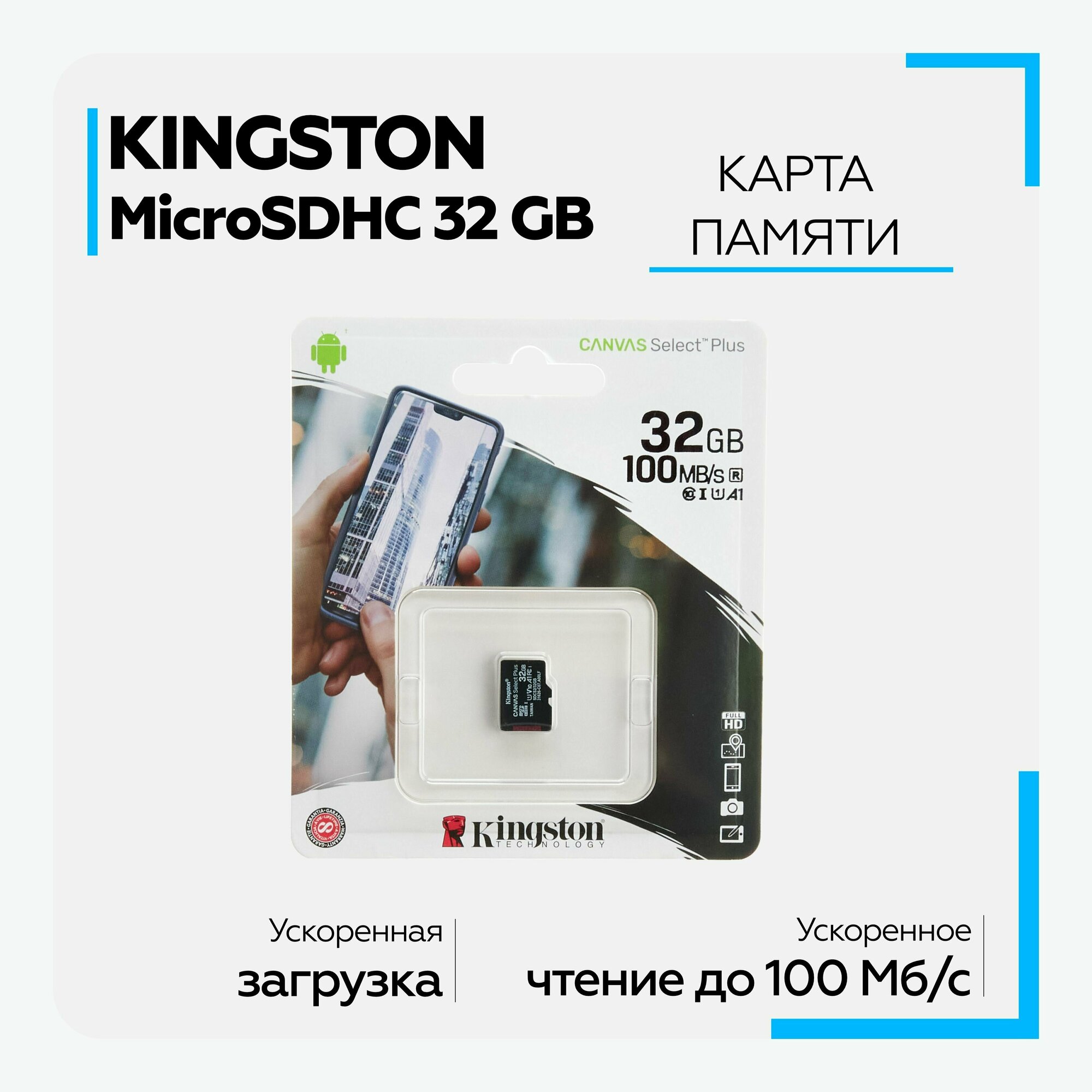 Карта памяти MicroSDHC 32GB Class 10 для Kingston Canvas Select Plus A1 100MB/s без адаптера