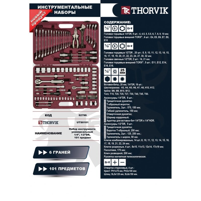 Набор Инструмента Thorvik Универсальный 1/4", 1/2"Dr, 101 Предмет THORVIK арт. UTS0101
