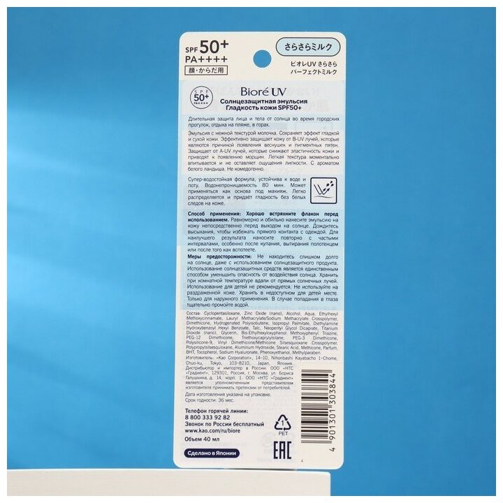 Biore Эмульсия солнцезащитная гладкость кожи spf 50 40мл