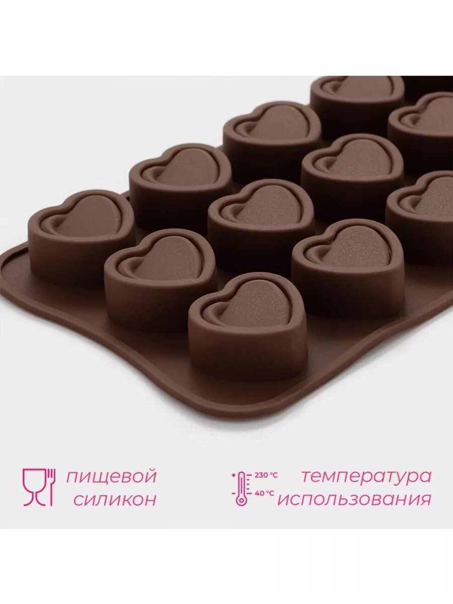 Форма для конфет и шоколада Доляна «Сердце», силикон, 21×10×1,5 см, 15 ячеек (2,9×2,7 см), цвет коричневый