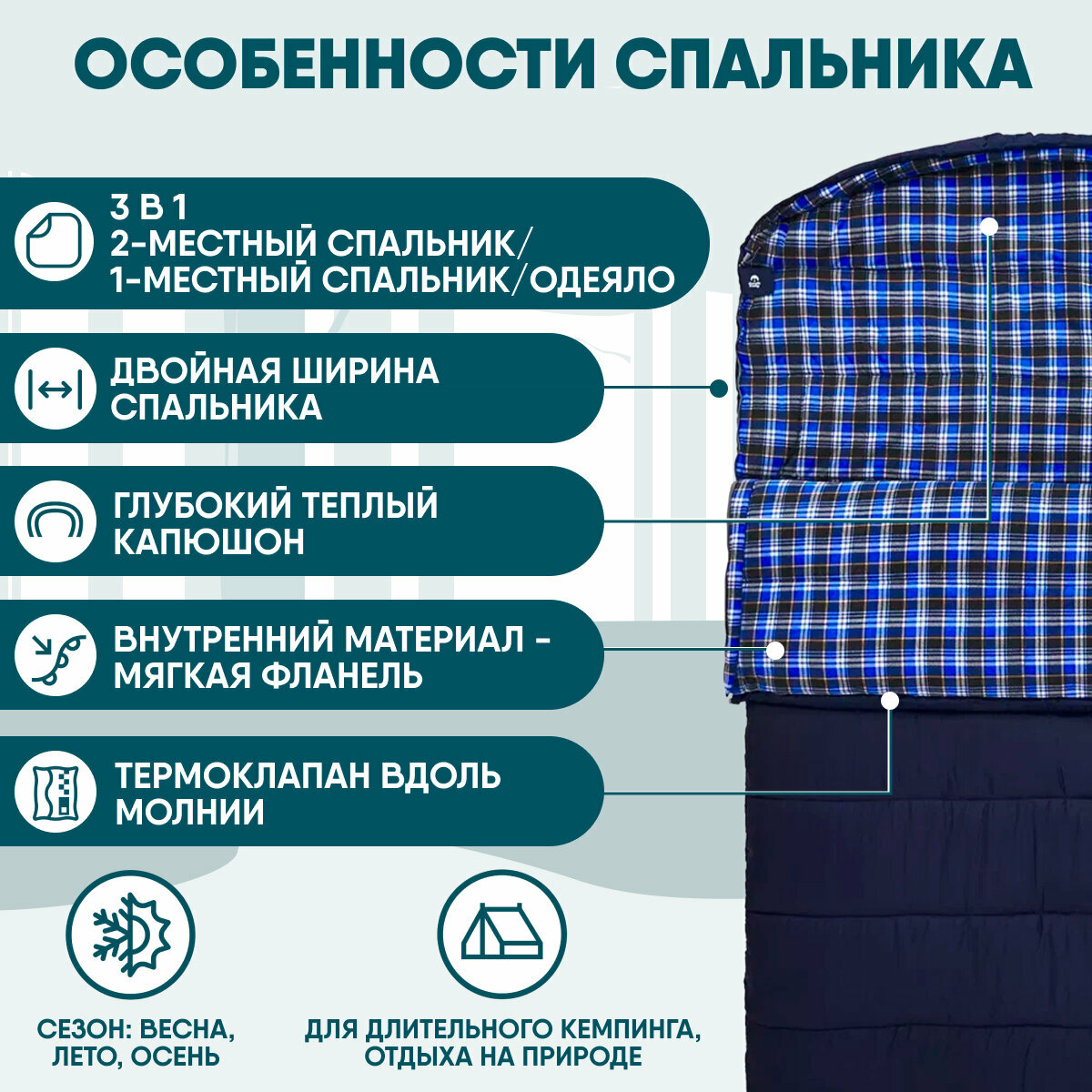 | Плюсы: | Теплый, комфортный, мягкая подкладка. Свободно помещаются 2 взрослых средней комплекции и ребенок 5 лет |