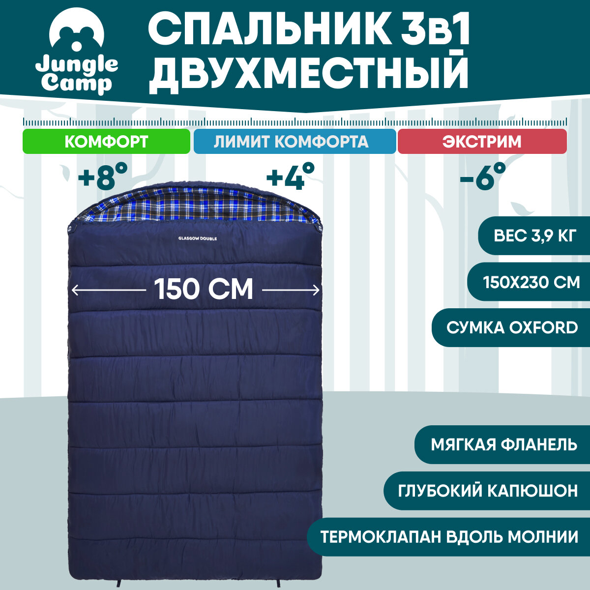 Спальный мешок Jungle Camp Glasgow Double, двухместный, с фланелью, цвет: синий