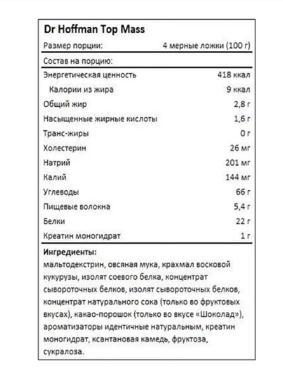Dr Hoffman Топ Mass 1кг - Высококалорийный гейнер для роста мышц с шоколадным вкусом