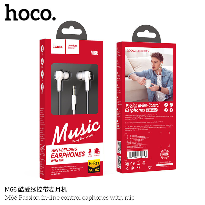 Наушники M66 Passion in-line control eaphones, HOCO, белый