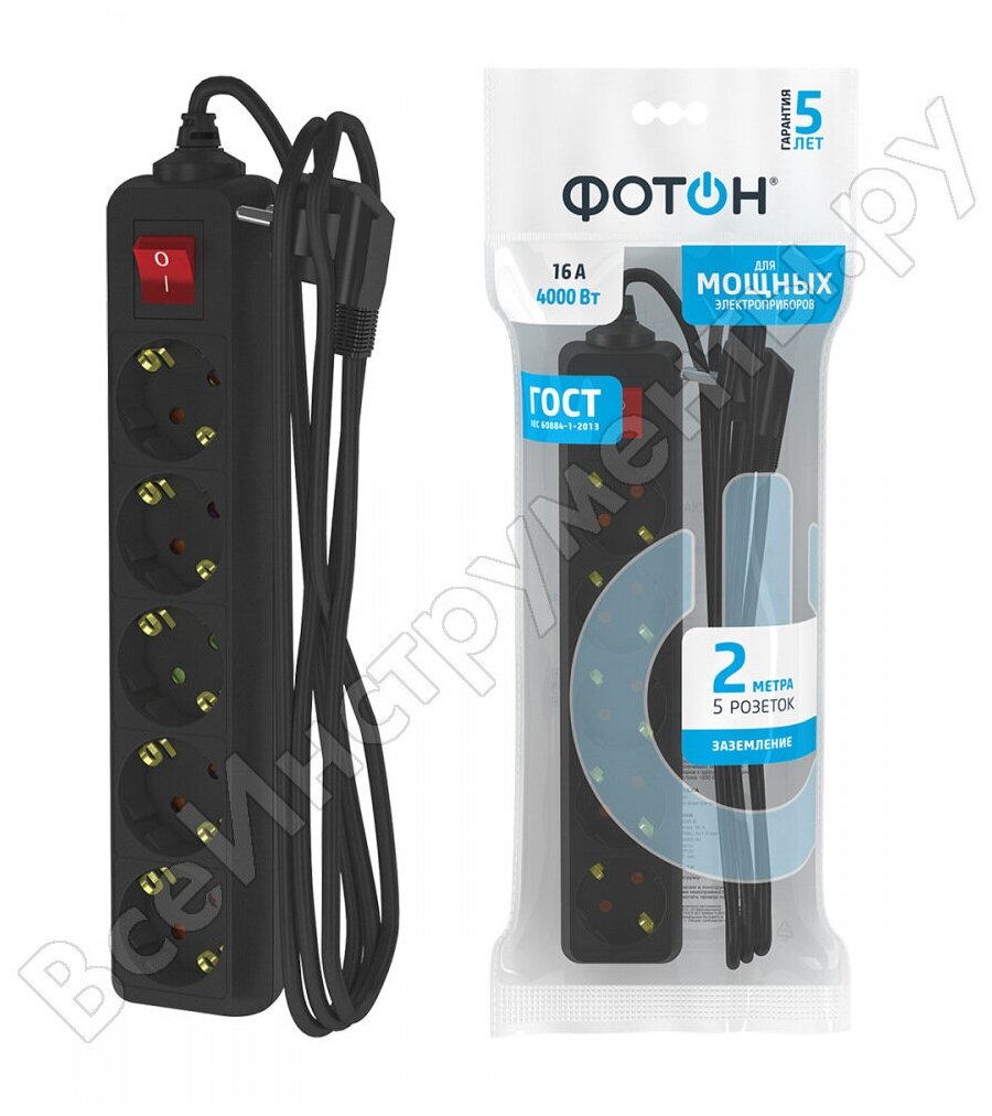 Удлинитель сетевой для розетки фотон 16А 2м 5 розеток с выключателем с заземлением черный, ГОСТ