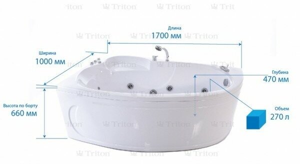 | Дополнительная информация | правосторонняя и левосторонняя; опции: смеситель, гидромассаж (6 форсунок), аэромассаж (10 форсунок), массаж спины (4 форсунки) |