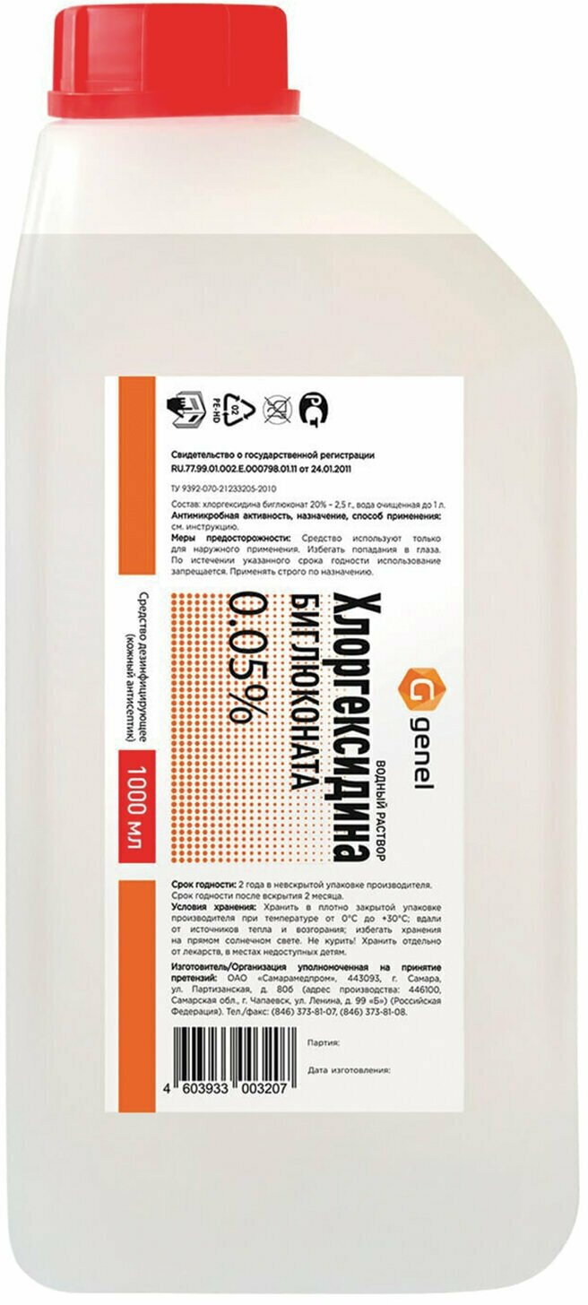 Genel средство дезинфицирующее (кожный антисептик) Водный раствор хлоргексидина биглюконата 0,05%, 1000 мл, тип крышки: винтовая