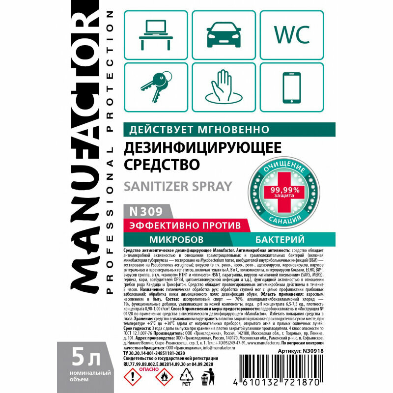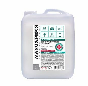 Антисептик для рук MANUFACTOR MANUFACTOR, 5 л,, N 309, дезинфицирующий спиртосодержащий (66%), готовый раствор