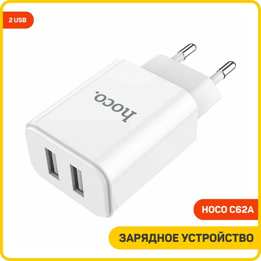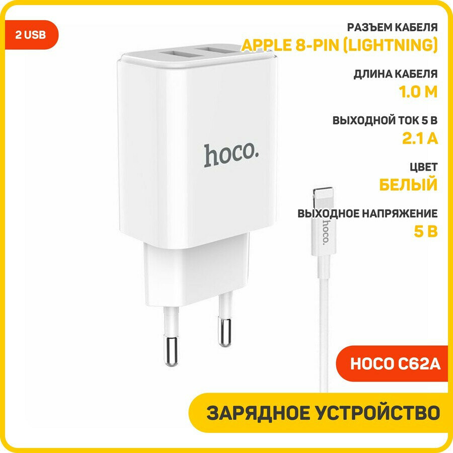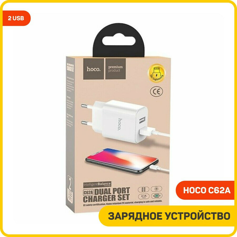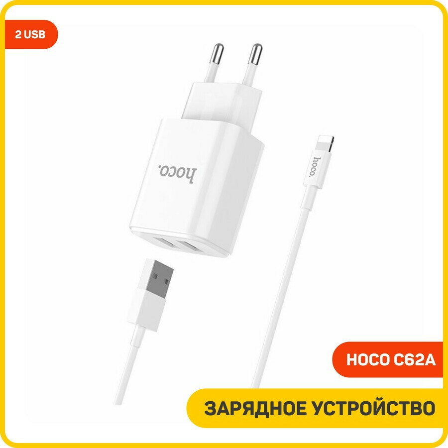 Сетевое зарядное устройство (СЗУ) Hoco C62A (2 USB) + кабель Lightning, 2.1 А, белый