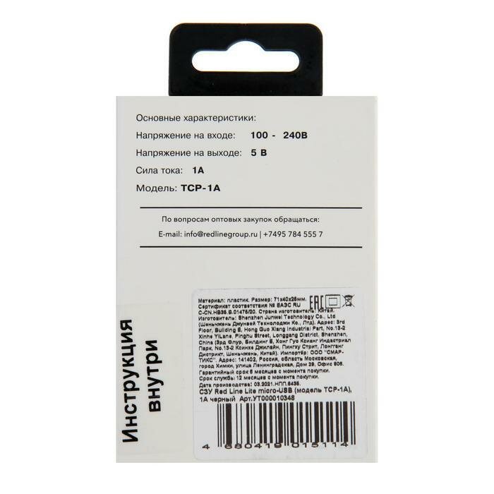 Зарядное устройство Red Line сетевое 220 В TCP-1A, micro USB 1 м, выходной ток 1 А (УТ000010348)