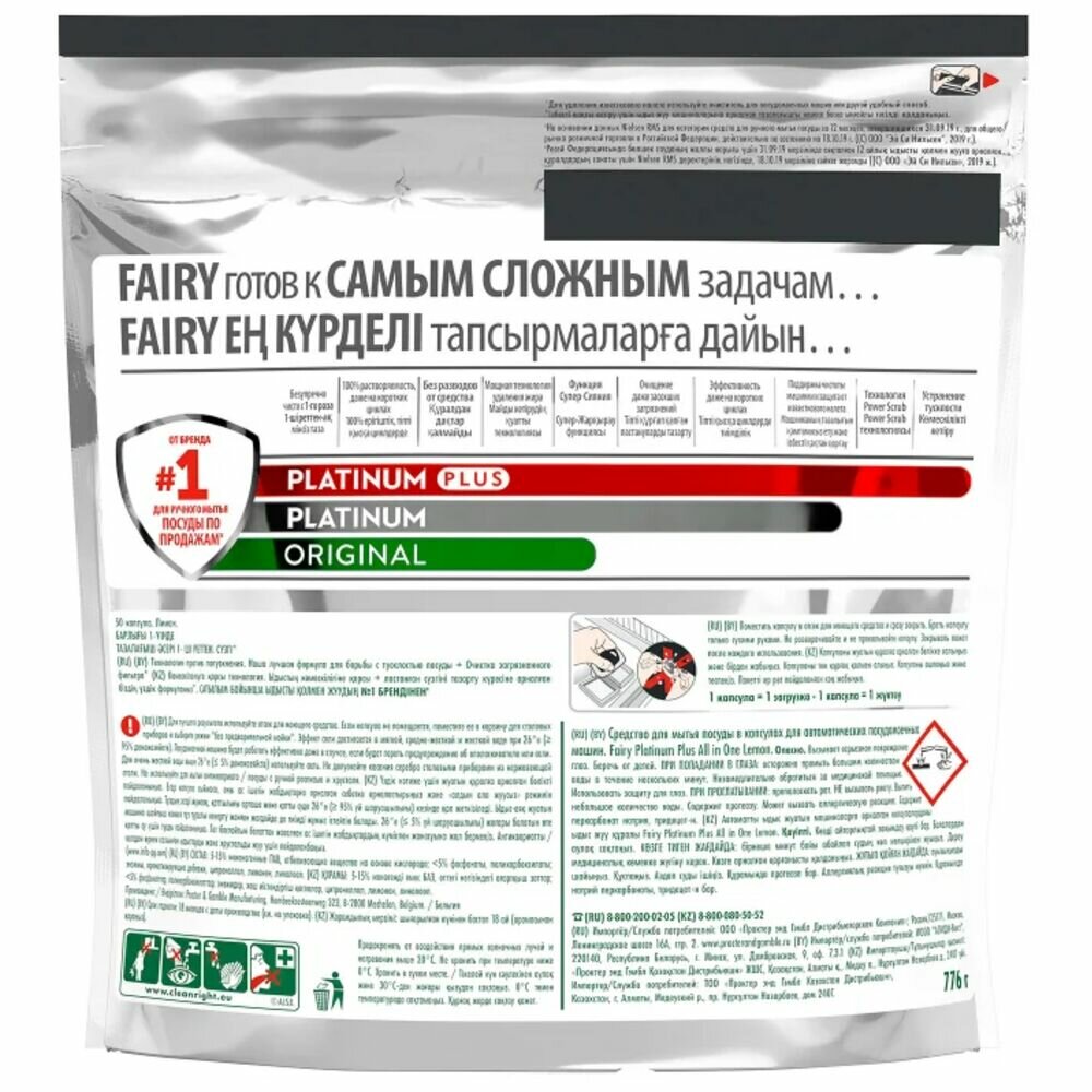 Капсулы для посудомоечной машины Fairy Platinum+ Все-в-Одном капсулы Лимон, 50 шт., пакет