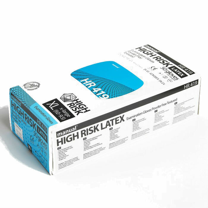 Купить Перчатки латексные медицинские Manual "High Risk HR419", XL, 50шт., неопудренные, особо прочные, картон. коробка
