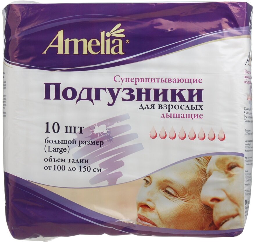 Подгузники для взрослых Amelia дышащие, L, 100-150 см, 10 шт. интересное: