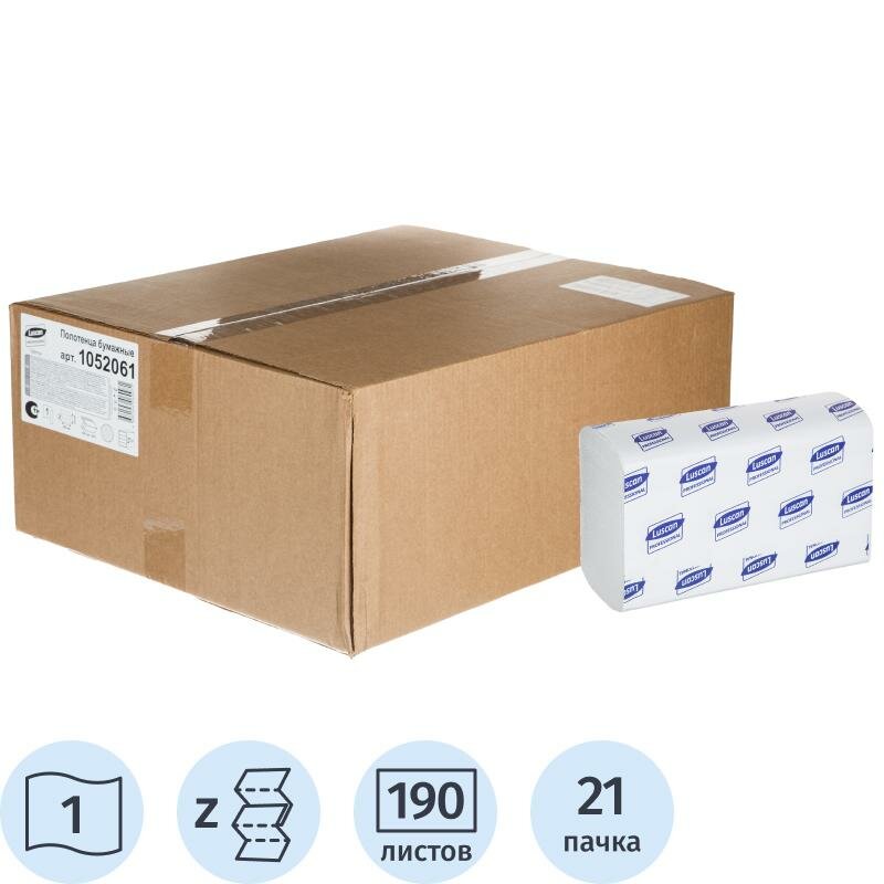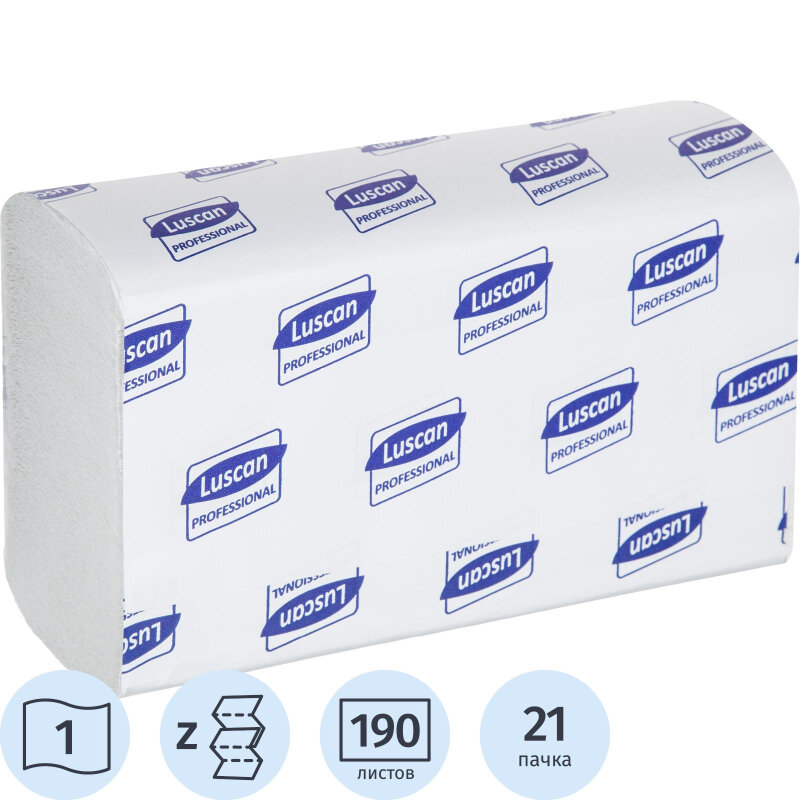 Полотенца бумажные для держателя 1-слойные Luscan Professional, листовые Z-сложения, 21 пачка по 190 листов (1052061)