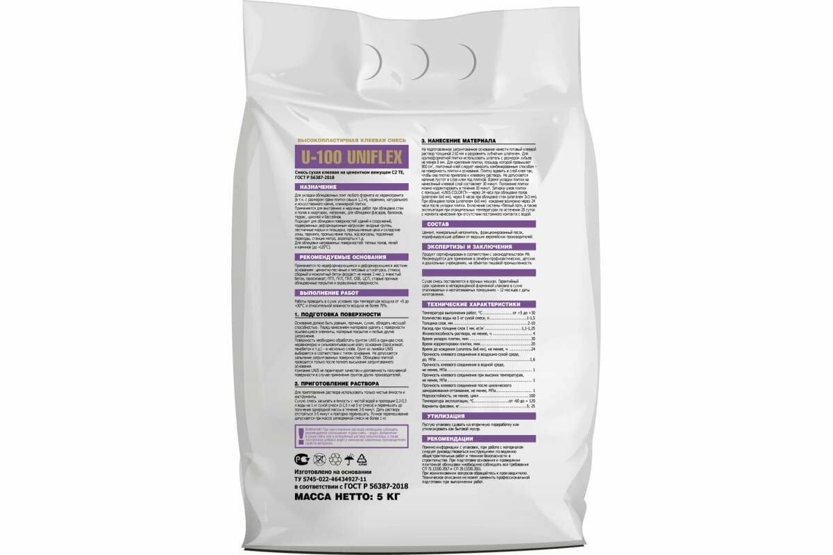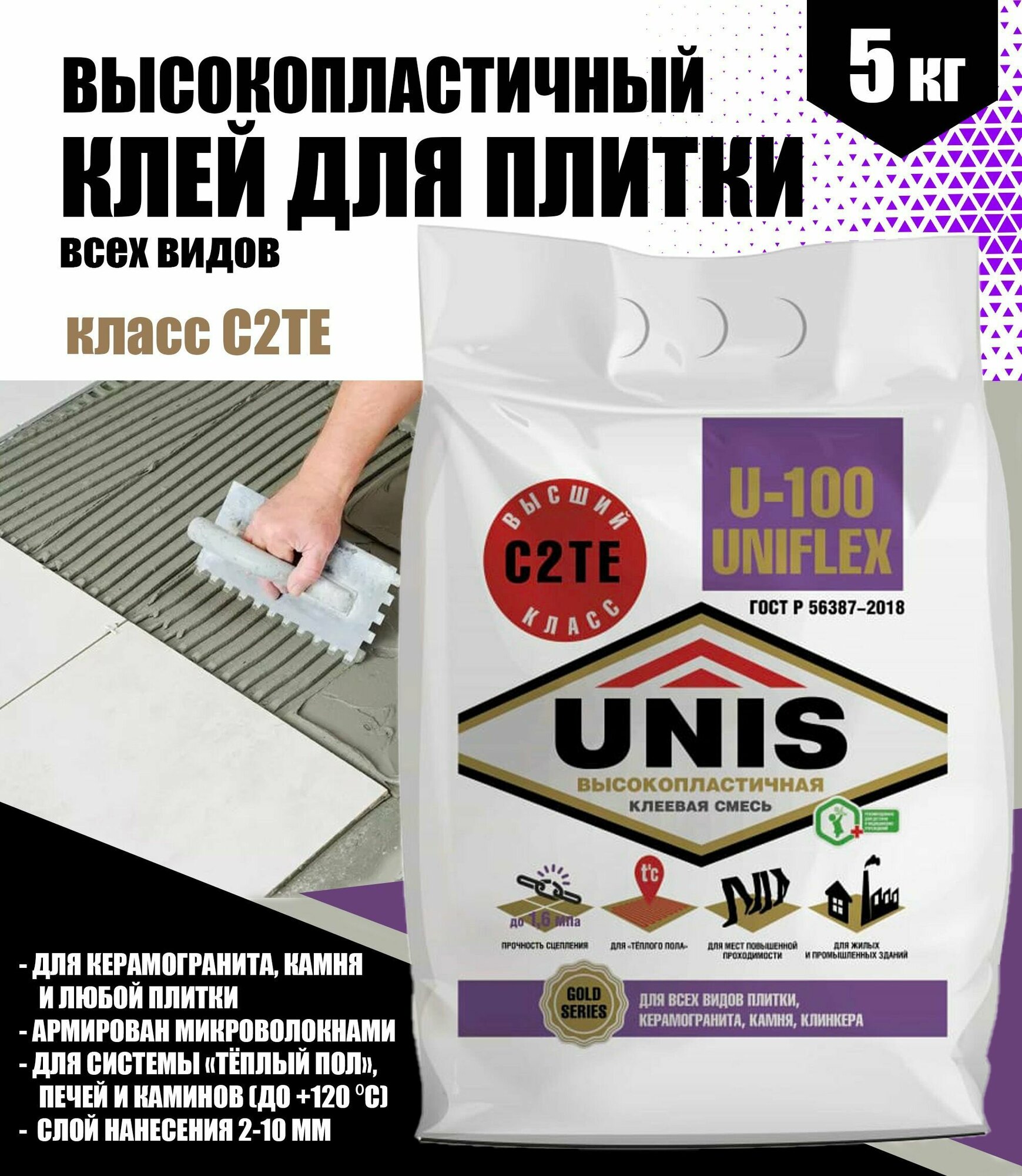Высокопластичный армированный клей Unis U-100 UNIFLEX для плитки любого типа и формата, керамогранита, камня, класс С2ТЕ, 5 кг