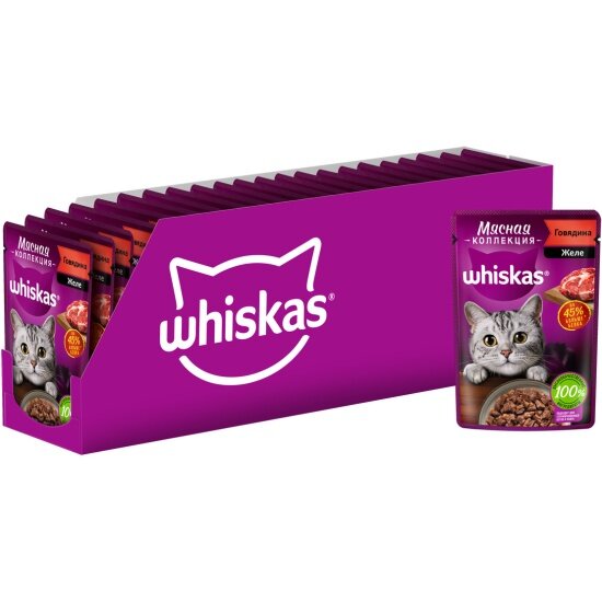 Купить WHISKAS мясная коллекция для взрослых кошек с говядиной в желе (75 гр х 28 шт)