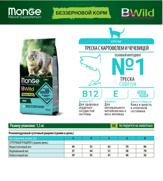 Сухой корм для кошек Monge BWILD Feed the Instinct, беззерновой, с треской, с картофелем, с чечевицей 1.5 кг